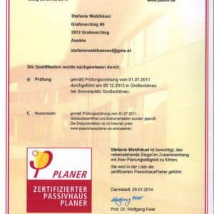 PassivhausPlaner Frau Stefanie Waldhäusl hat im Dezember 2013 die Ausbildung zum zertifizierten PassivhausPlaner erfolgreich abgeschlossen.